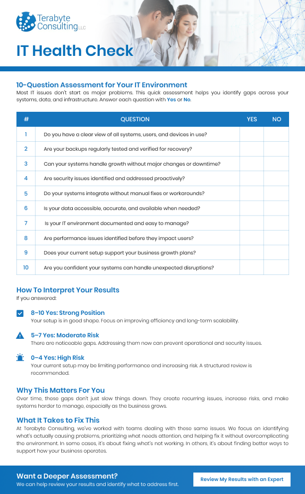Download the IT Health Checklist to quickly spot inefficiencies, reduce risks, and strengthen your technology foundation.